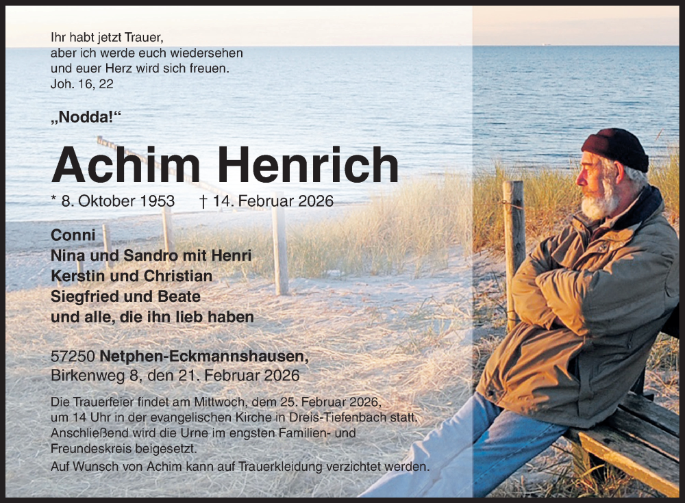 Hier finden Sie alle Traueranzeigen aus der Zeitung, die bisher für Achim Henrich erschienen sind. Weitere Traueranzeigen, die in der Zeitung erscheinen, werden hier ebenfalls aufgelistet