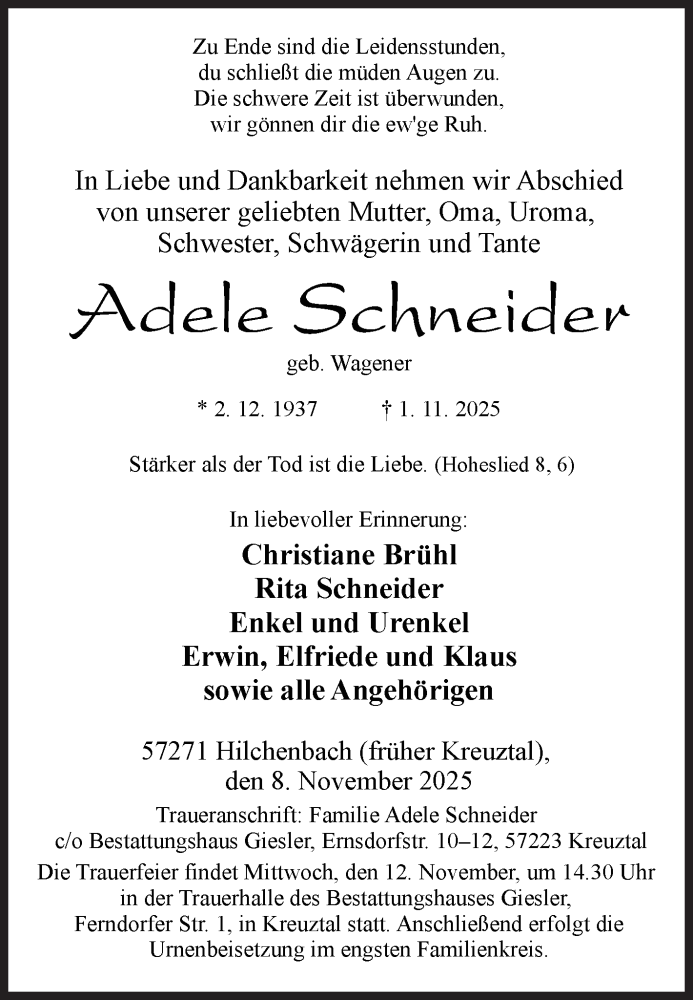Hier finden Sie alle Traueranzeigen aus der Zeitung, die bisher für Adele Schneider erschienen sind. Weitere Traueranzeigen, die in der Zeitung erscheinen, werden hier ebenfalls aufgelistet