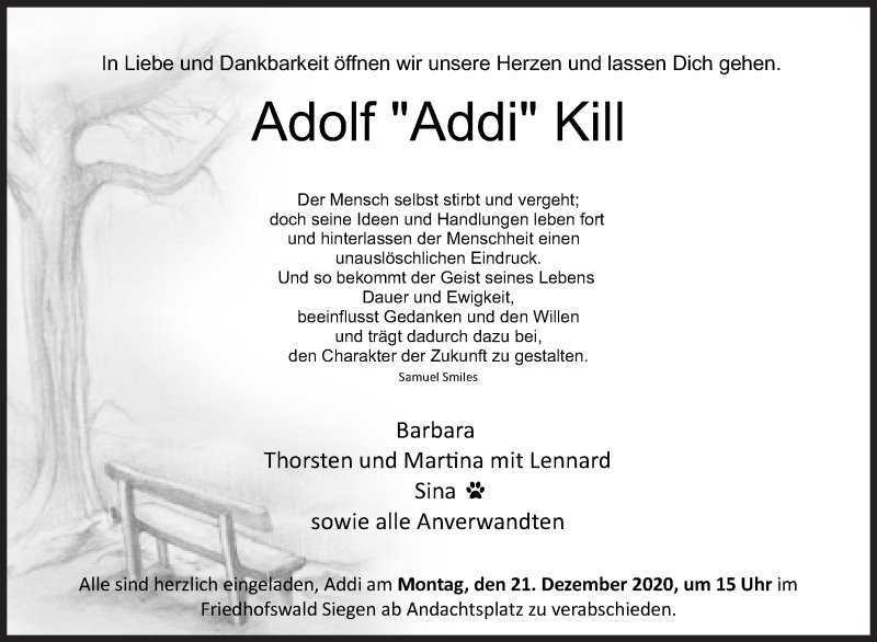 Hier finden Sie alle Traueranzeigen aus der Zeitung, die bisher für Adolf Kill erschienen sind. Weitere Traueranzeigen, die in der Zeitung erscheinen, werden hier ebenfalls aufgelistet