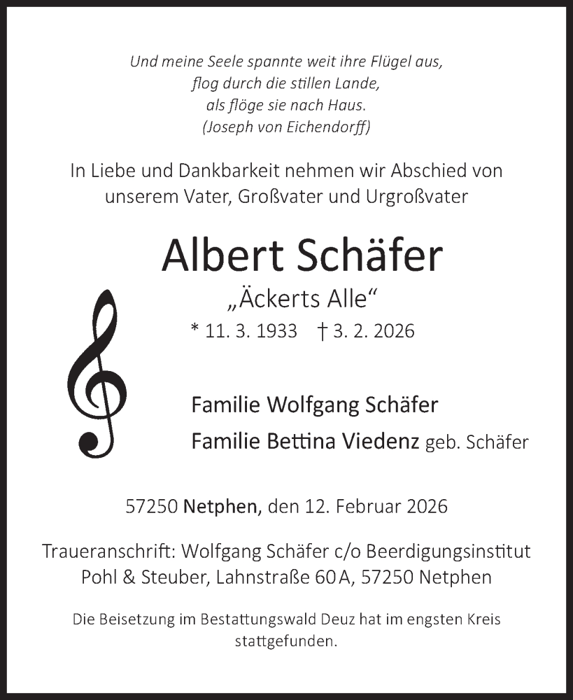 Hier finden Sie alle Traueranzeigen aus der Zeitung, die bisher für Albert Schäfer erschienen sind. Weitere Traueranzeigen, die in der Zeitung erscheinen, werden hier ebenfalls aufgelistet