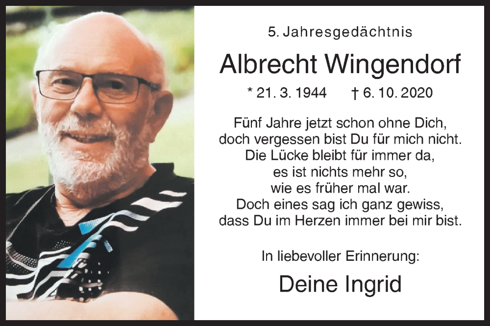 Hier finden Sie alle Traueranzeigen aus der Zeitung, die bisher für Albrecht Wingendorf erschienen sind. Weitere Traueranzeigen, die in der Zeitung erscheinen, werden hier ebenfalls aufgelistet
