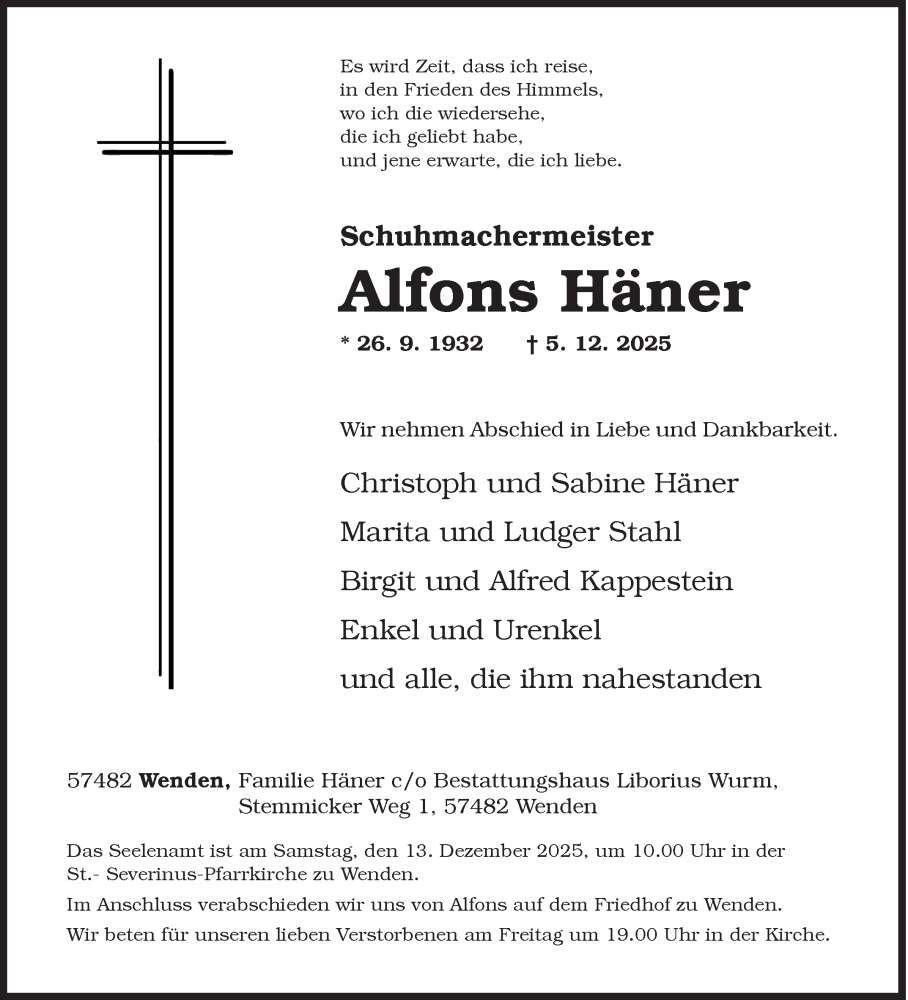 Hier finden Sie alle Traueranzeigen aus der Zeitung, die bisher für Alfons Häner erschienen sind. Weitere Traueranzeigen, die in der Zeitung erscheinen, werden hier ebenfalls aufgelistet