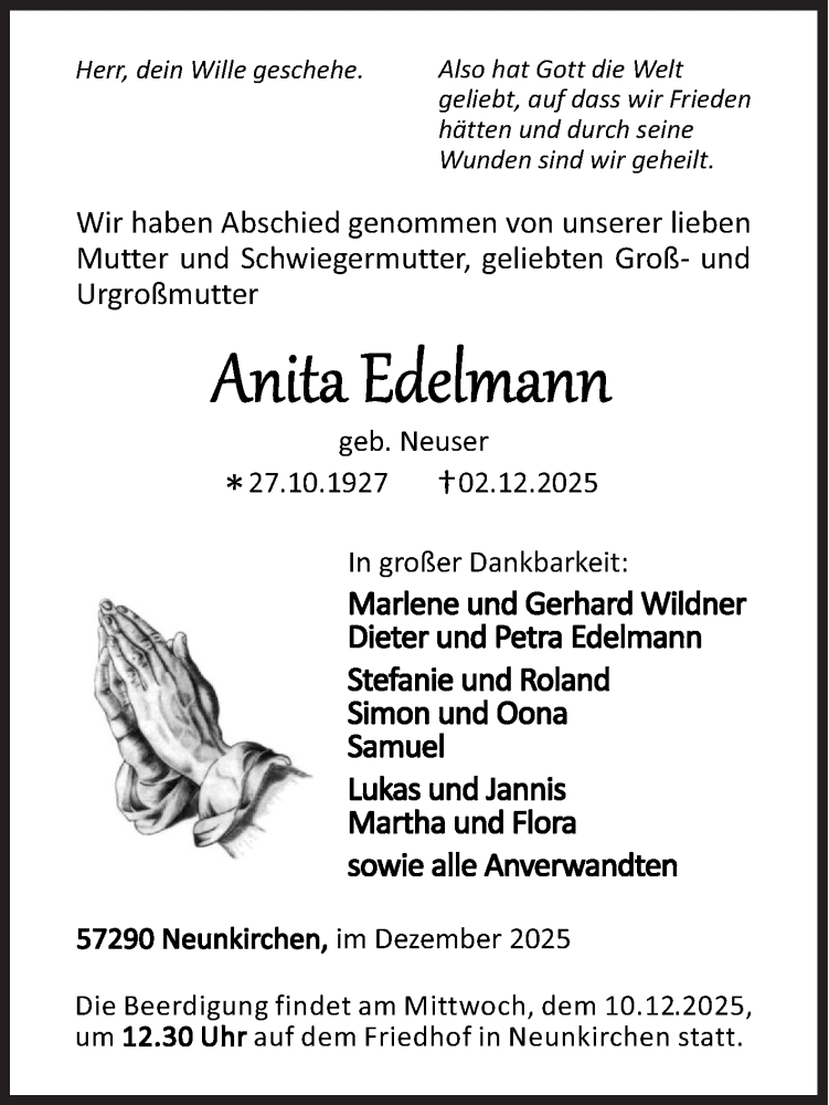 Hier finden Sie alle Traueranzeigen aus der Zeitung, die bisher für Anita Edelmann erschienen sind. Weitere Traueranzeigen, die in der Zeitung erscheinen, werden hier ebenfalls aufgelistet