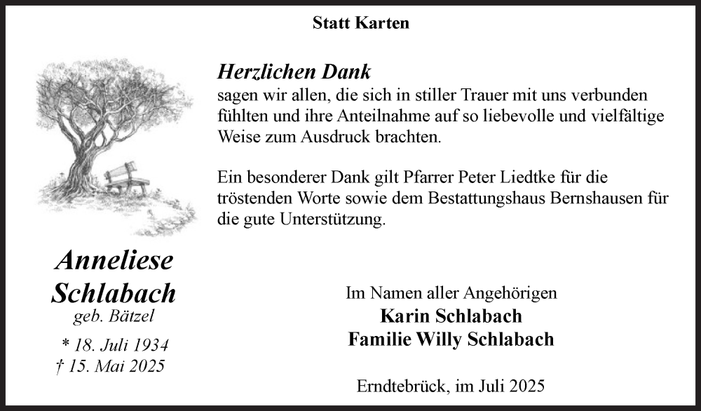 Hier finden Sie alle Traueranzeigen aus der Zeitung, die bisher für Anneliese Schlabach erschienen sind. Weitere Traueranzeigen, die in der Zeitung erscheinen, werden hier ebenfalls aufgelistet