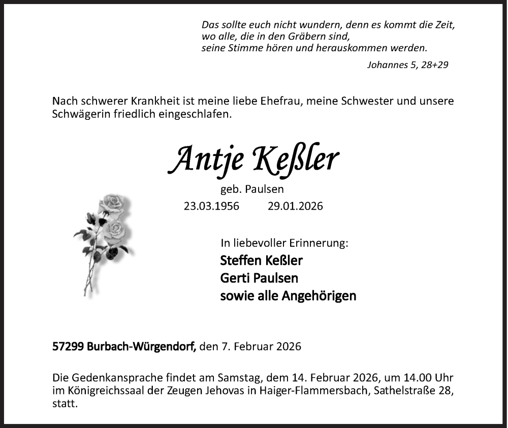 Hier finden Sie alle Traueranzeigen aus der Zeitung, die bisher für Antje Keßler erschienen sind. Weitere Traueranzeigen, die in der Zeitung erscheinen, werden hier ebenfalls aufgelistet