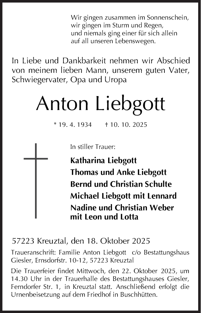 Hier finden Sie alle Traueranzeigen aus der Zeitung, die bisher für Anton Liebgott erschienen sind. Weitere Traueranzeigen, die in der Zeitung erscheinen, werden hier ebenfalls aufgelistet