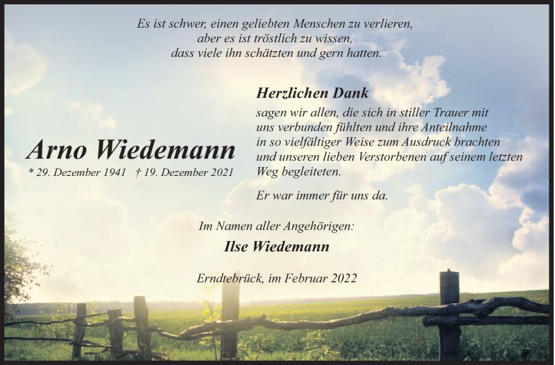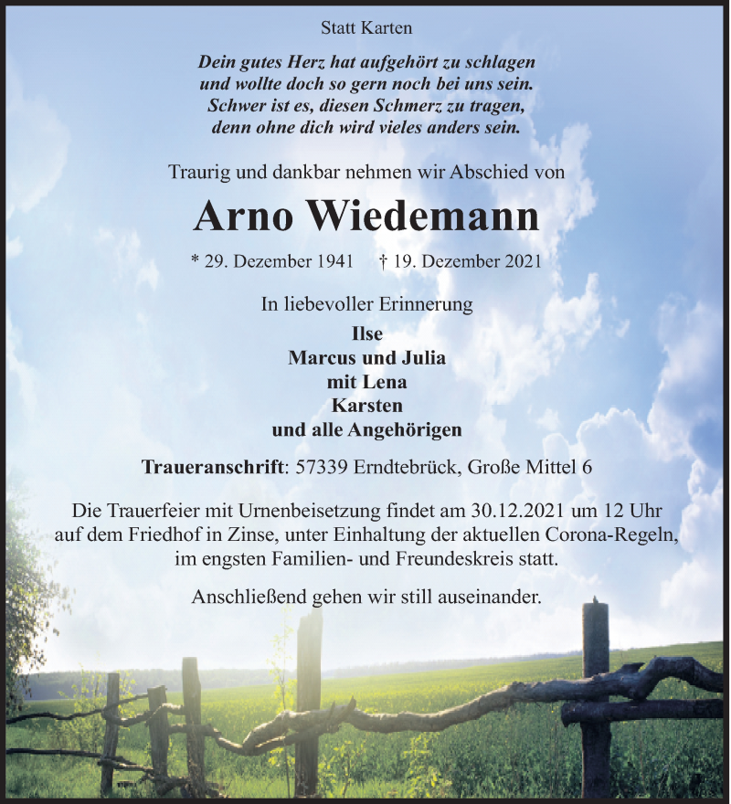 Hier finden Sie alle Traueranzeigen aus der Zeitung, die bisher für Arno Wiedemann erschienen sind. Weitere Traueranzeigen, die in der Zeitung erscheinen, werden hier ebenfalls aufgelistet