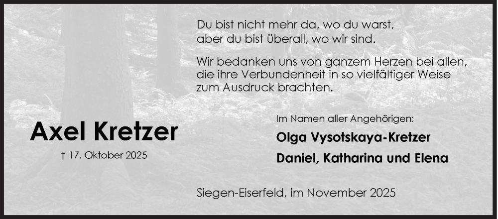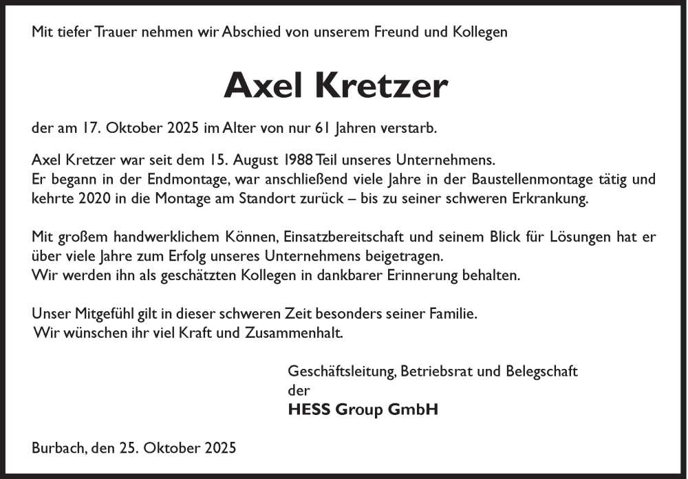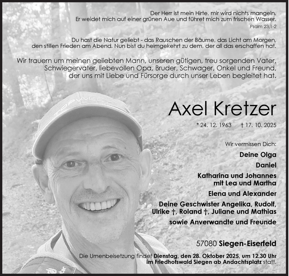 Hier finden Sie alle Traueranzeigen aus der Zeitung, die bisher für Axel Kretzer erschienen sind. Weitere Traueranzeigen, die in der Zeitung erscheinen, werden hier ebenfalls aufgelistet