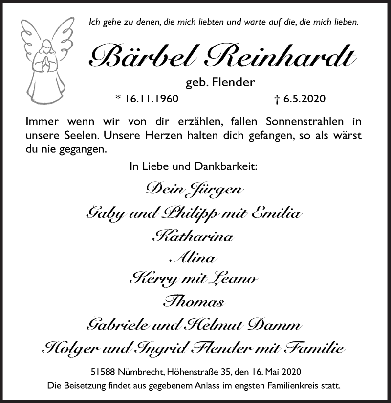 Hier finden Sie alle Traueranzeigen aus der Zeitung, die bisher für Bärbel Reinhardt erschienen sind. Weitere Traueranzeigen, die in der Zeitung erscheinen, werden hier ebenfalls aufgelistet
