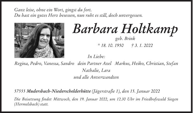 Hier finden Sie alle Traueranzeigen aus der Zeitung, die bisher für Barbara Holtkamp erschienen sind. Weitere Traueranzeigen, die in der Zeitung erscheinen, werden hier ebenfalls aufgelistet