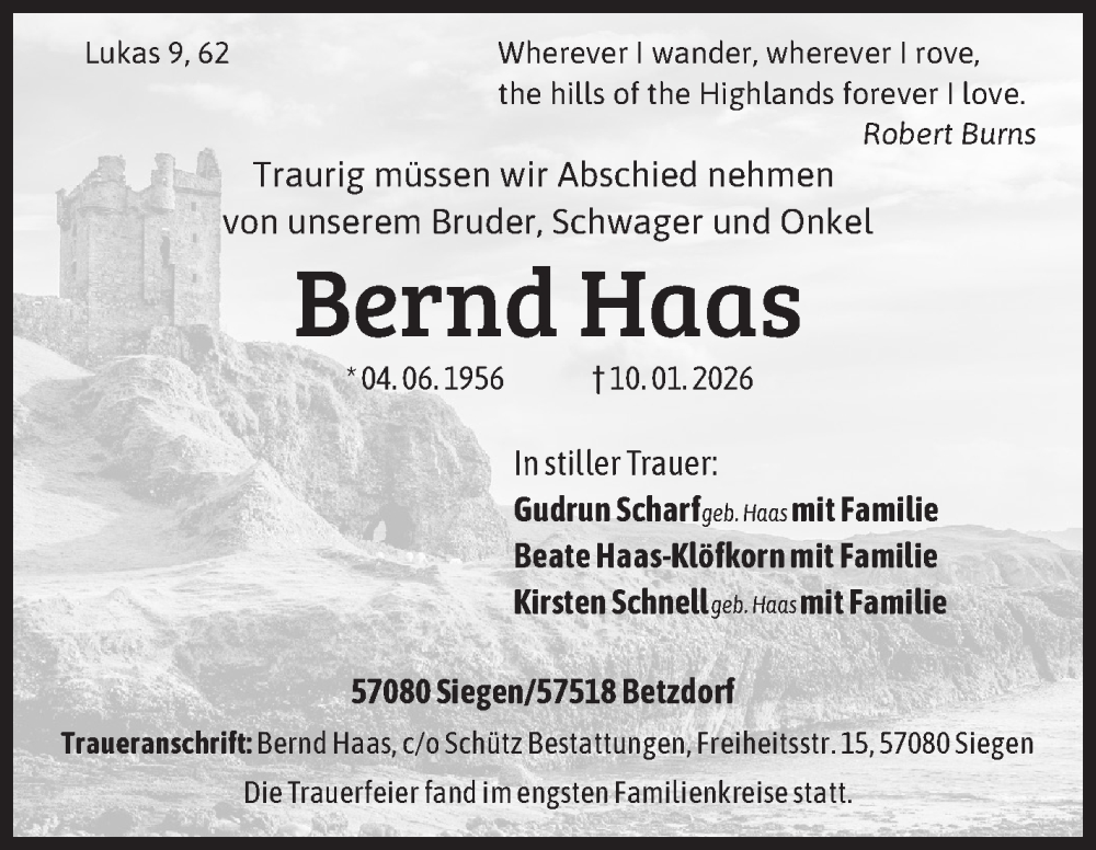 Hier finden Sie alle Traueranzeigen aus der Zeitung, die bisher für Bernd Haas erschienen sind. Weitere Traueranzeigen, die in der Zeitung erscheinen, werden hier ebenfalls aufgelistet