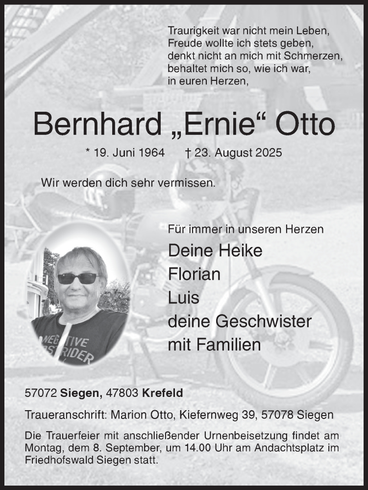 Hier finden Sie alle Traueranzeigen aus der Zeitung, die bisher für Bernhard Otto erschienen sind. Weitere Traueranzeigen, die in der Zeitung erscheinen, werden hier ebenfalls aufgelistet