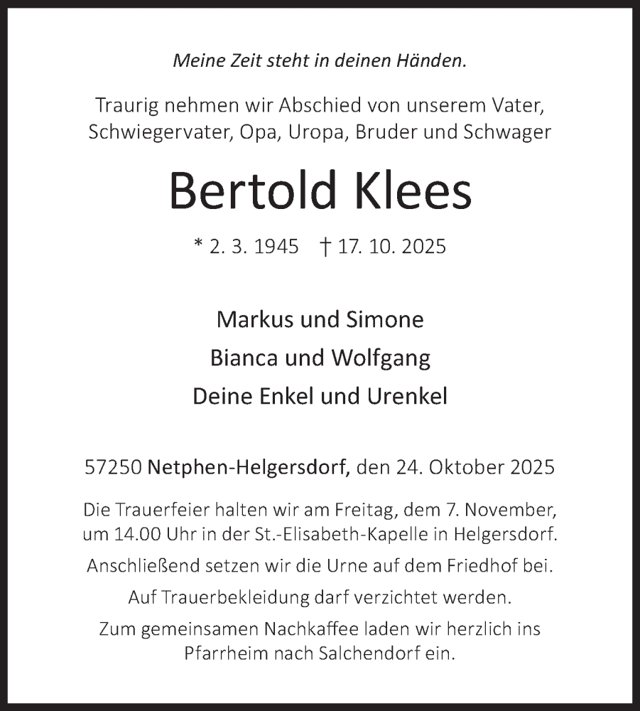 Hier finden Sie alle Traueranzeigen aus der Zeitung, die bisher für Bertold Klees erschienen sind. Weitere Traueranzeigen, die in der Zeitung erscheinen, werden hier ebenfalls aufgelistet
