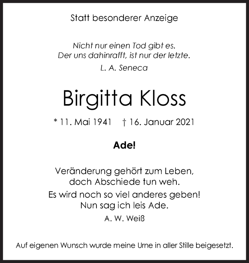Hier finden Sie alle Traueranzeigen aus der Zeitung, die bisher für Birgitta Kloss erschienen sind. Weitere Traueranzeigen, die in der Zeitung erscheinen, werden hier ebenfalls aufgelistet