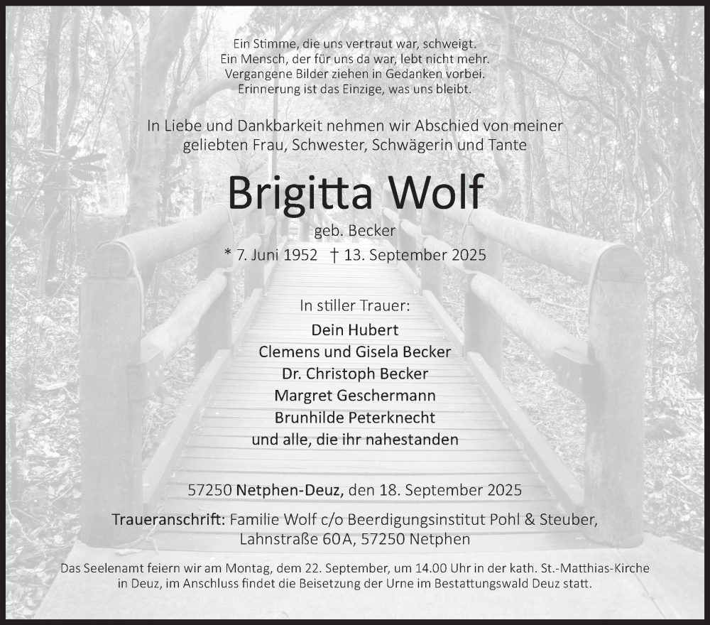 Hier finden Sie alle Traueranzeigen aus der Zeitung, die bisher für Brigitta Wolf erschienen sind. Weitere Traueranzeigen, die in der Zeitung erscheinen, werden hier ebenfalls aufgelistet