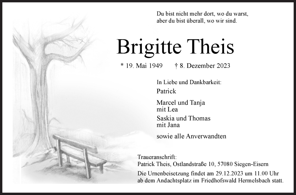 Hier finden Sie alle Traueranzeigen aus der Zeitung, die bisher für Brigitte Theis erschienen sind. Weitere Traueranzeigen, die in der Zeitung erscheinen, werden hier ebenfalls aufgelistet