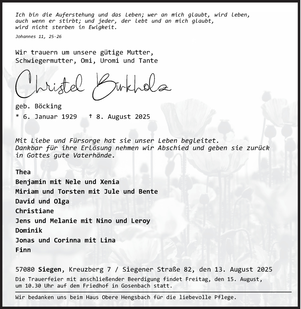 Hier finden Sie alle Traueranzeigen aus der Zeitung, die bisher für Christel Birkholz erschienen sind. Weitere Traueranzeigen, die in der Zeitung erscheinen, werden hier ebenfalls aufgelistet