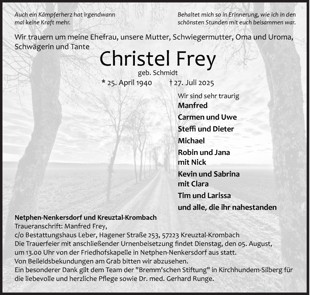 Hier finden Sie alle Traueranzeigen aus der Zeitung, die bisher für Christel Frey erschienen sind. Weitere Traueranzeigen, die in der Zeitung erscheinen, werden hier ebenfalls aufgelistet
