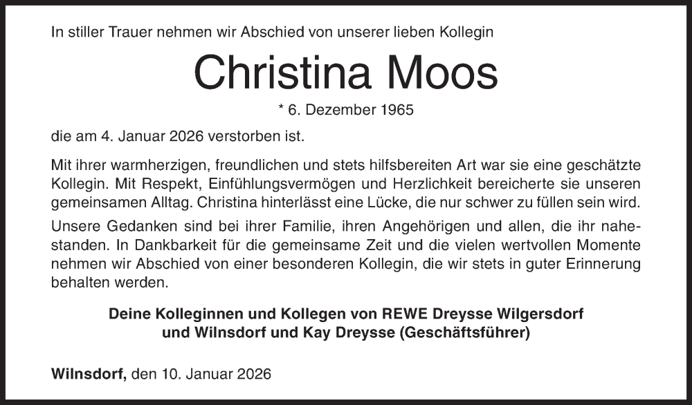 Hier finden Sie alle Traueranzeigen aus der Zeitung, die bisher für Christina Moos erschienen sind. Weitere Traueranzeigen, die in der Zeitung erscheinen, werden hier ebenfalls aufgelistet