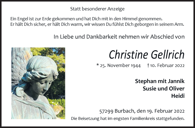 Hier finden Sie alle Traueranzeigen aus der Zeitung, die bisher für Christine Gellrich erschienen sind. Weitere Traueranzeigen, die in der Zeitung erscheinen, werden hier ebenfalls aufgelistet