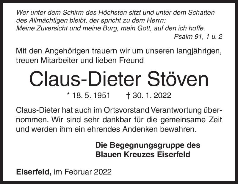 Hier finden Sie alle Traueranzeigen aus der Zeitung, die bisher für Claus-Dieter Stöven erschienen sind. Weitere Traueranzeigen, die in der Zeitung erscheinen, werden hier ebenfalls aufgelistet