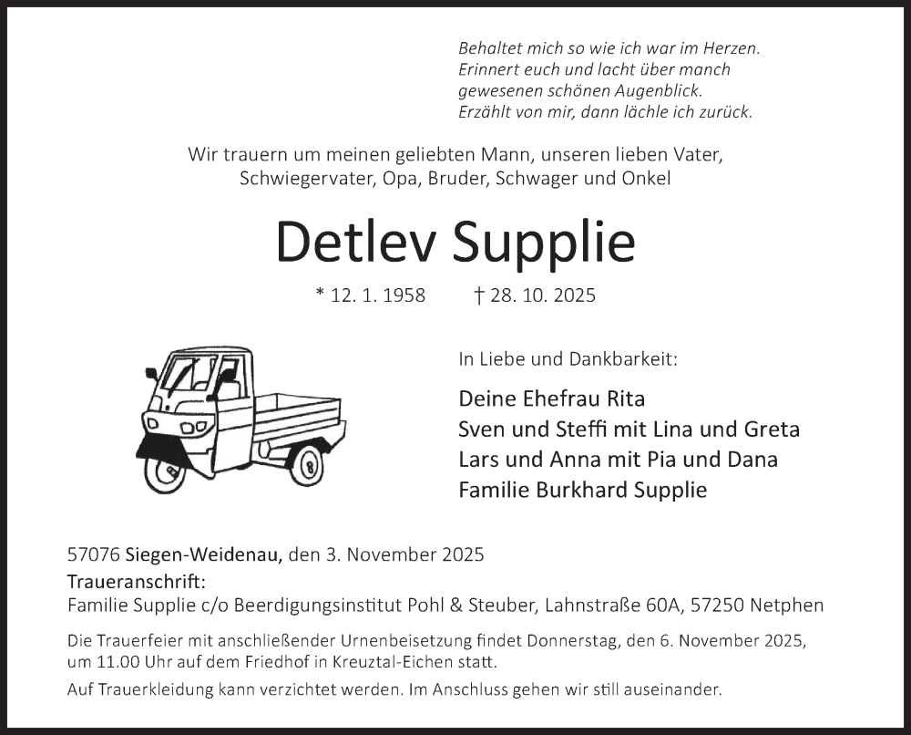 Hier finden Sie alle Traueranzeigen aus der Zeitung, die bisher für Detlev Supplie erschienen sind. Weitere Traueranzeigen, die in der Zeitung erscheinen, werden hier ebenfalls aufgelistet