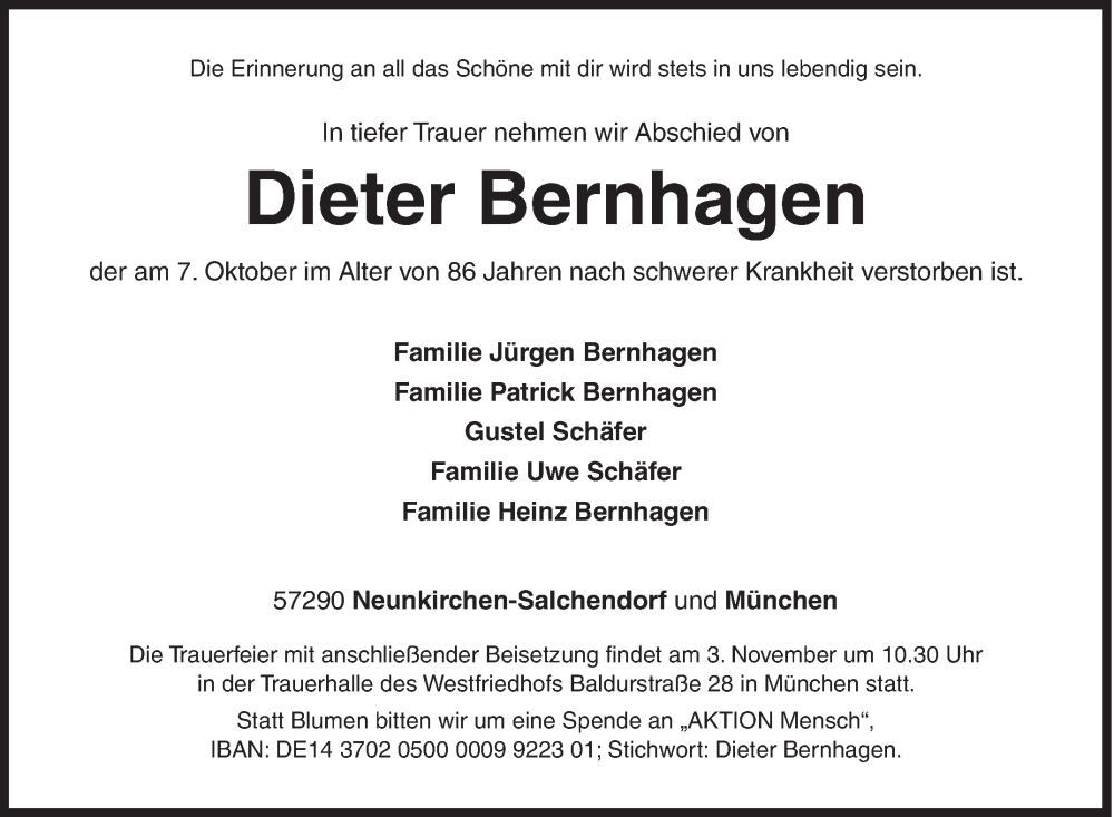 Hier finden Sie alle Traueranzeigen aus der Zeitung, die bisher für Dieter Bernhagen erschienen sind. Weitere Traueranzeigen, die in der Zeitung erscheinen, werden hier ebenfalls aufgelistet