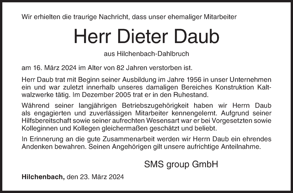 Hier finden Sie alle Traueranzeigen aus der Zeitung, die bisher für Dieter Daub erschienen sind. Weitere Traueranzeigen, die in der Zeitung erscheinen, werden hier ebenfalls aufgelistet
