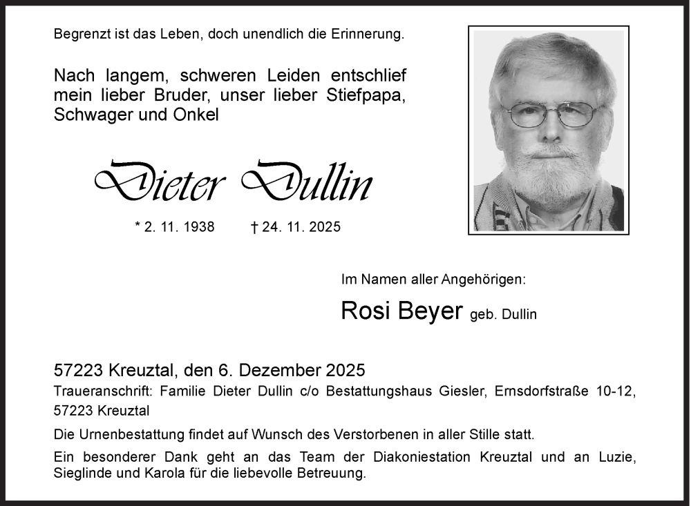 Hier finden Sie alle Traueranzeigen aus der Zeitung, die bisher für Dieter Dullin erschienen sind. Weitere Traueranzeigen, die in der Zeitung erscheinen, werden hier ebenfalls aufgelistet