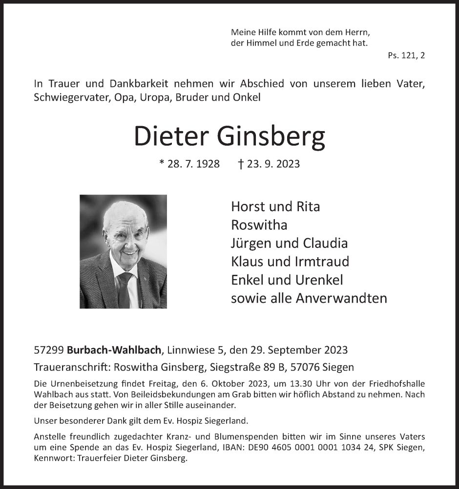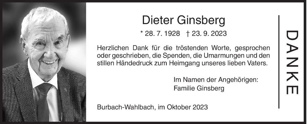 Hier finden Sie alle Traueranzeigen aus der Zeitung, die bisher für Dieter Ginsberg erschienen sind. Weitere Traueranzeigen, die in der Zeitung erscheinen, werden hier ebenfalls aufgelistet