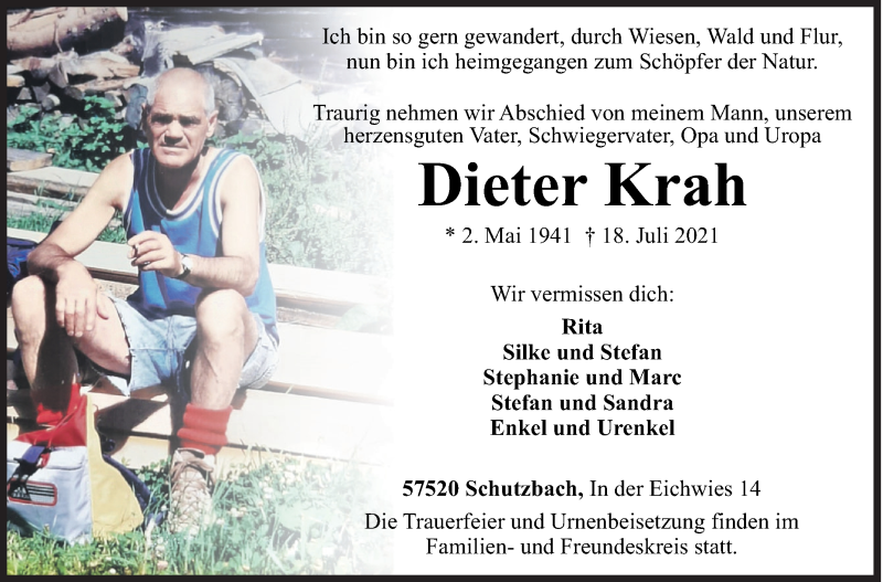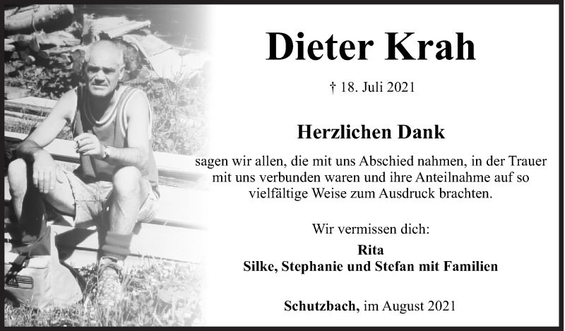 Hier finden Sie alle Traueranzeigen aus der Zeitung, die bisher für Dieter Krah erschienen sind. Weitere Traueranzeigen, die in der Zeitung erscheinen, werden hier ebenfalls aufgelistet