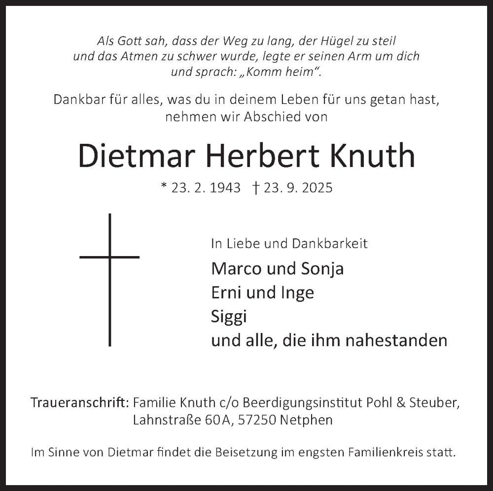 Hier finden Sie alle Traueranzeigen aus der Zeitung, die bisher für Dietmar Herbert Knuth erschienen sind. Weitere Traueranzeigen, die in der Zeitung erscheinen, werden hier ebenfalls aufgelistet