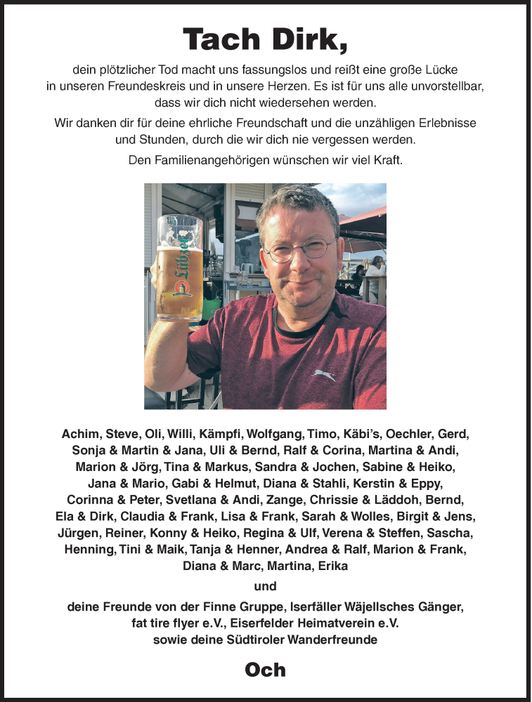 Hier finden Sie alle Traueranzeigen aus der Zeitung, die bisher für Dirk erschienen sind. Weitere Traueranzeigen, die in der Zeitung erscheinen, werden hier ebenfalls aufgelistet