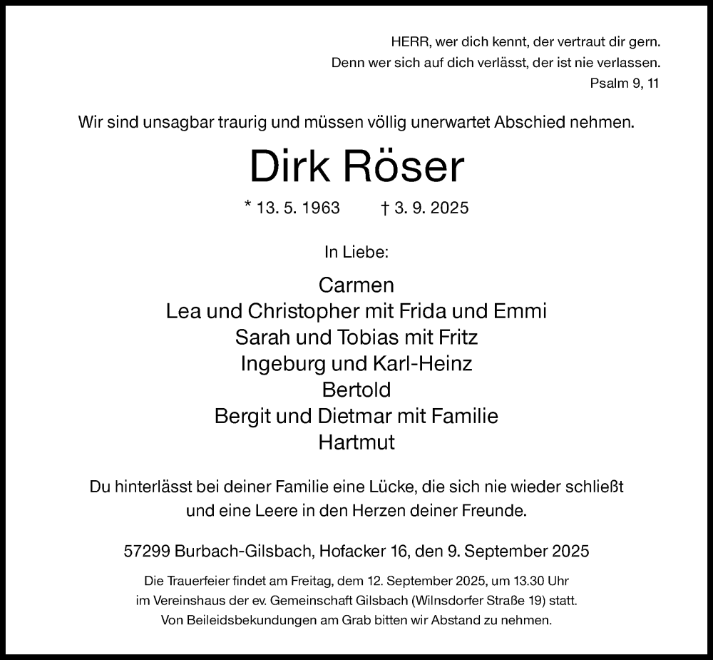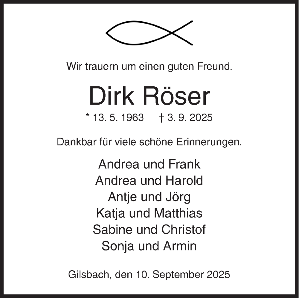 Hier finden Sie alle Traueranzeigen aus der Zeitung, die bisher für Dirk Röser erschienen sind. Weitere Traueranzeigen, die in der Zeitung erscheinen, werden hier ebenfalls aufgelistet