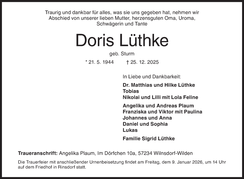 Hier finden Sie alle Traueranzeigen aus der Zeitung, die bisher für Doris Lüthke erschienen sind. Weitere Traueranzeigen, die in der Zeitung erscheinen, werden hier ebenfalls aufgelistet