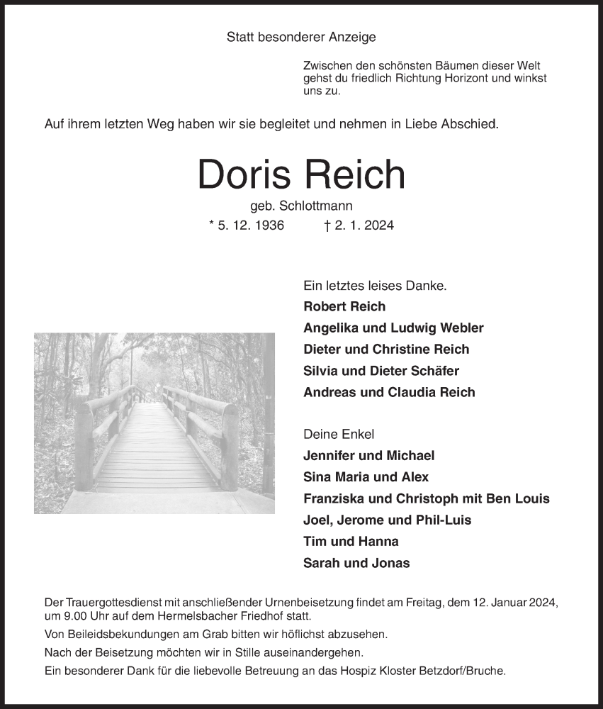 Hier finden Sie alle Traueranzeigen aus der Zeitung, die bisher für Doris Reich erschienen sind. Weitere Traueranzeigen, die in der Zeitung erscheinen, werden hier ebenfalls aufgelistet