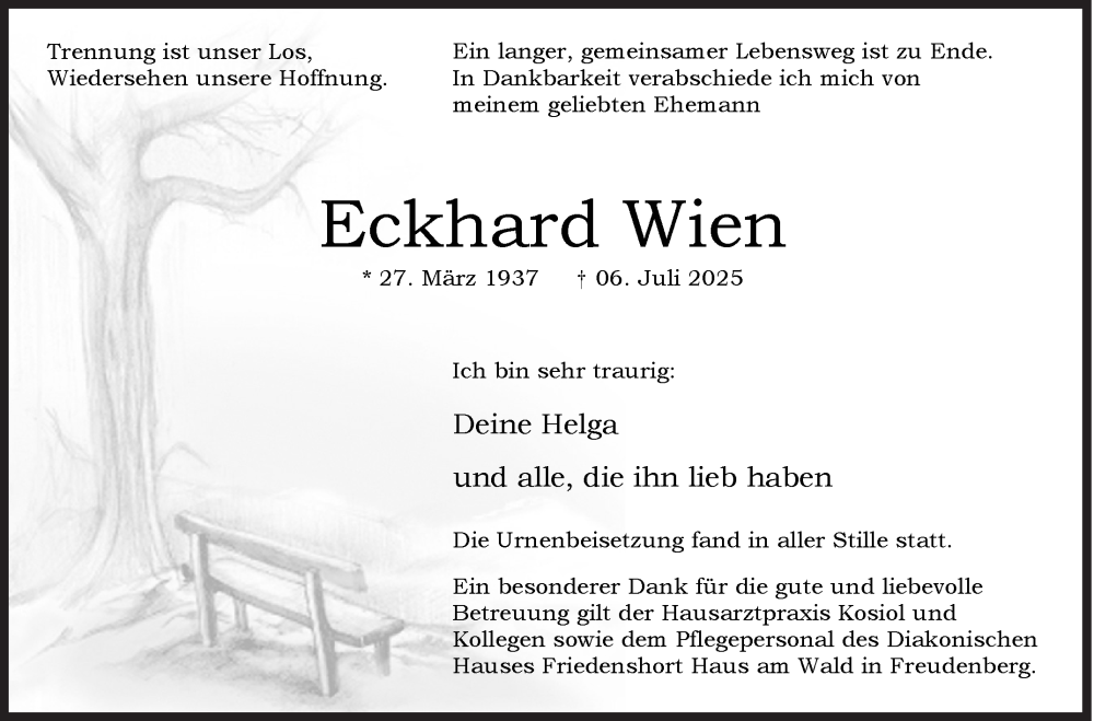 Hier finden Sie alle Traueranzeigen aus der Zeitung, die bisher für Eckhard Wien erschienen sind. Weitere Traueranzeigen, die in der Zeitung erscheinen, werden hier ebenfalls aufgelistet
