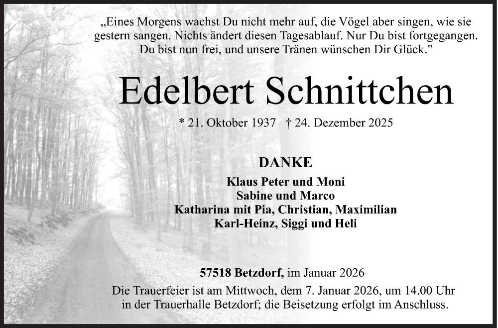 Hier finden Sie alle Traueranzeigen aus der Zeitung, die bisher für Edelbert Schnittchen erschienen sind. Weitere Traueranzeigen, die in der Zeitung erscheinen, werden hier ebenfalls aufgelistet