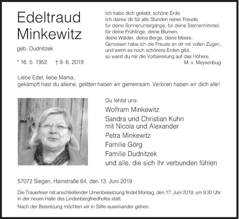Hier finden Sie alle Traueranzeigen aus der Zeitung, die bisher für Edeltraud Minkewitz erschienen sind. Weitere Traueranzeigen, die in der Zeitung erscheinen, werden hier ebenfalls aufgelistet