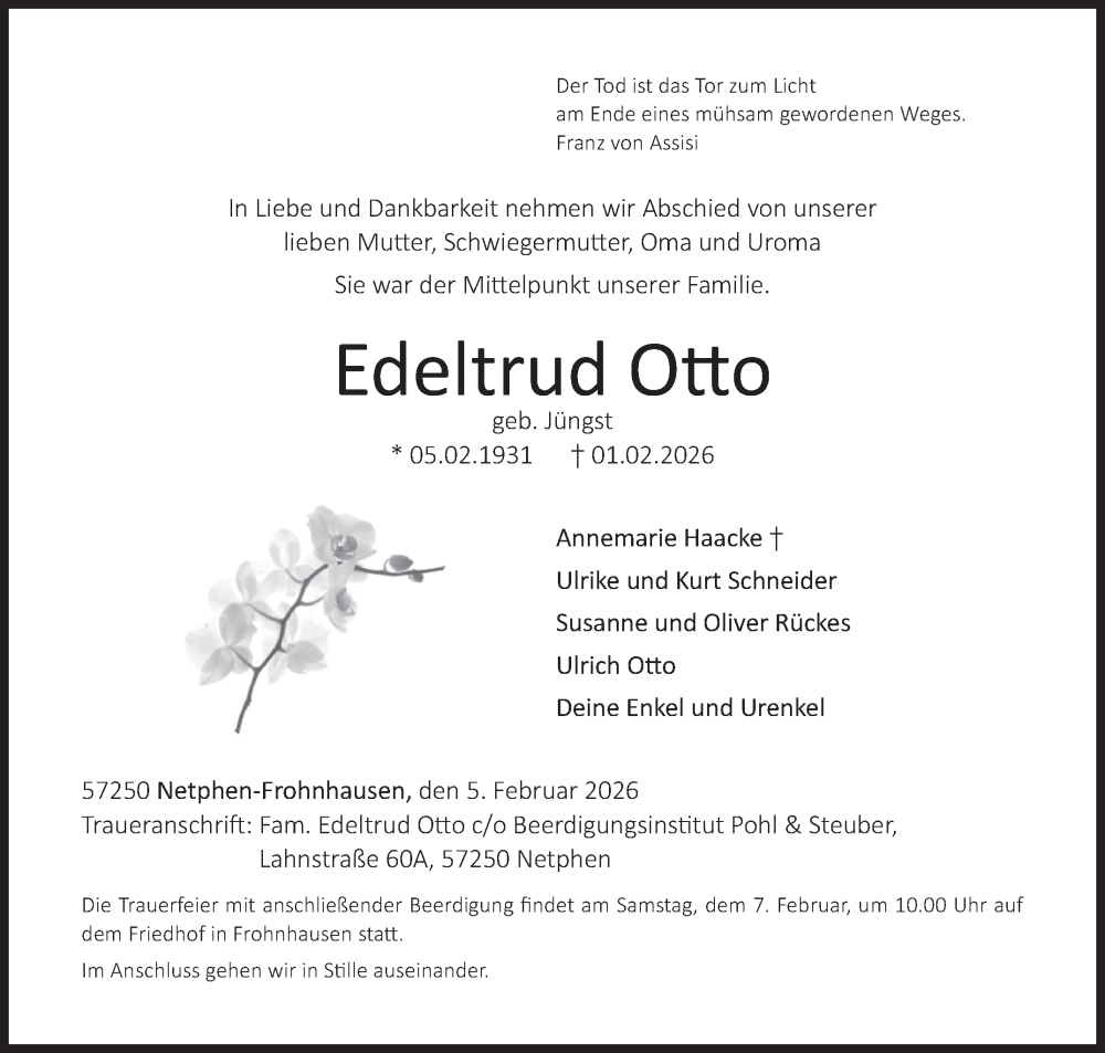 Hier finden Sie alle Traueranzeigen aus der Zeitung, die bisher für Edeltrud Otto erschienen sind. Weitere Traueranzeigen, die in der Zeitung erscheinen, werden hier ebenfalls aufgelistet
