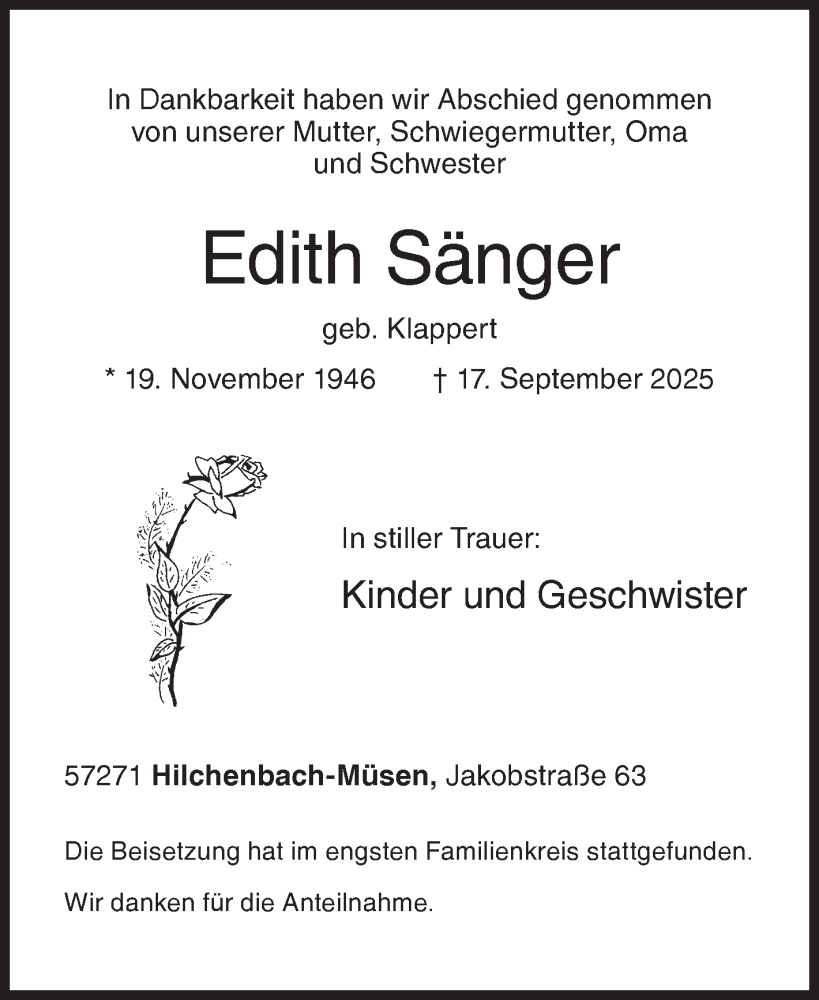 Hier finden Sie alle Traueranzeigen aus der Zeitung, die bisher für Edith Sänger erschienen sind. Weitere Traueranzeigen, die in der Zeitung erscheinen, werden hier ebenfalls aufgelistet