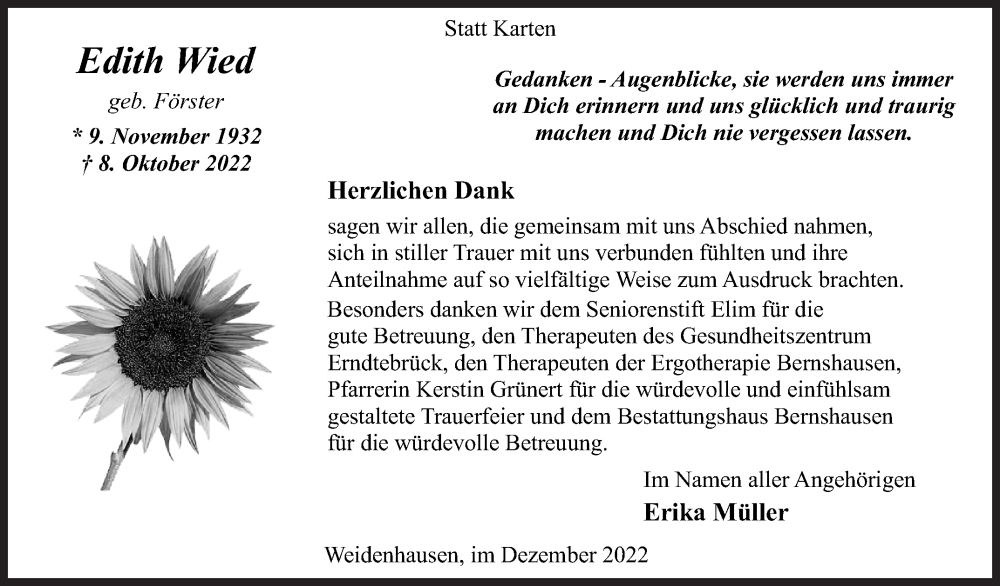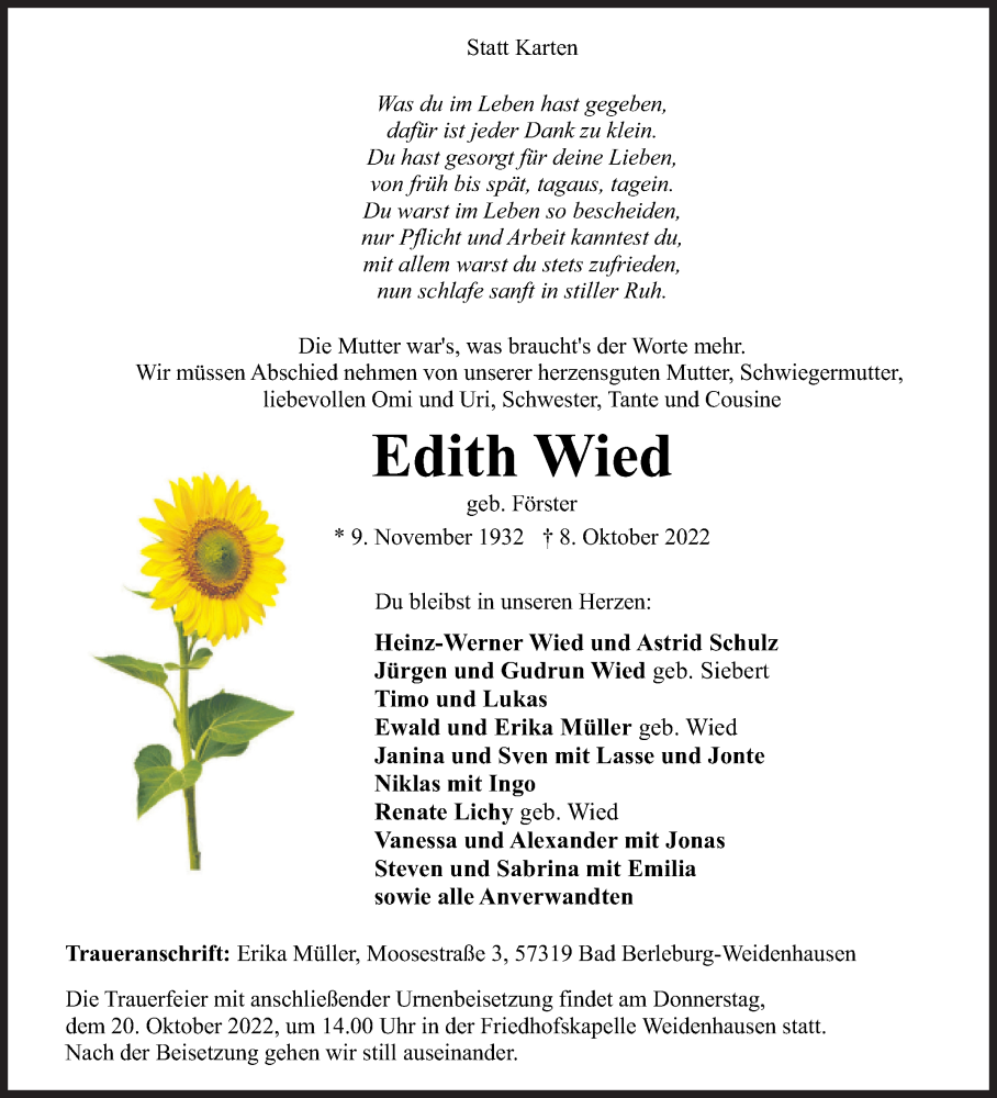 Hier finden Sie alle Traueranzeigen aus der Zeitung, die bisher für Edith Wied erschienen sind. Weitere Traueranzeigen, die in der Zeitung erscheinen, werden hier ebenfalls aufgelistet