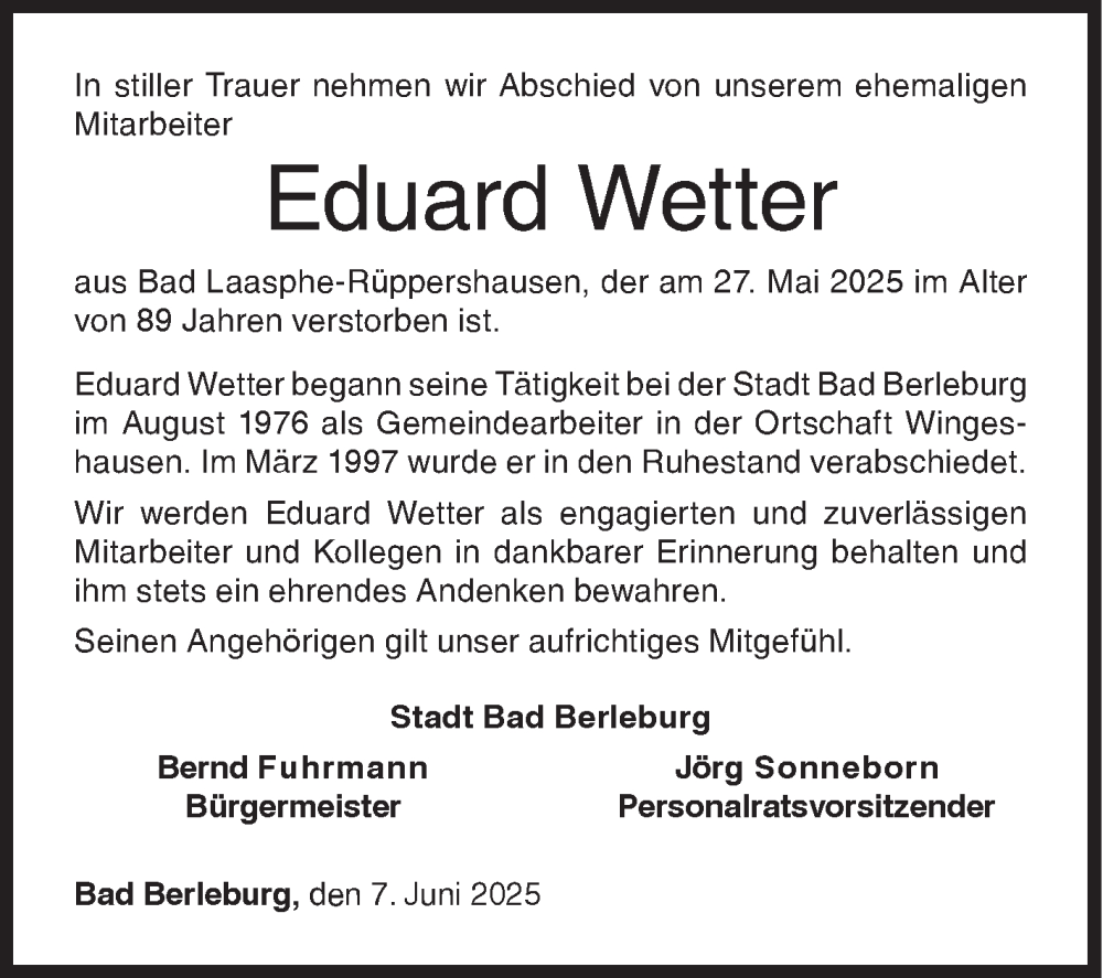 Hier finden Sie alle Traueranzeigen aus der Zeitung, die bisher für Eduard Wetter erschienen sind. Weitere Traueranzeigen, die in der Zeitung erscheinen, werden hier ebenfalls aufgelistet