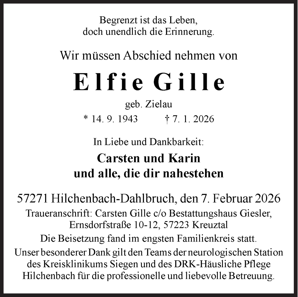 Hier finden Sie alle Traueranzeigen aus der Zeitung, die bisher für Elfie Gille erschienen sind. Weitere Traueranzeigen, die in der Zeitung erscheinen, werden hier ebenfalls aufgelistet
