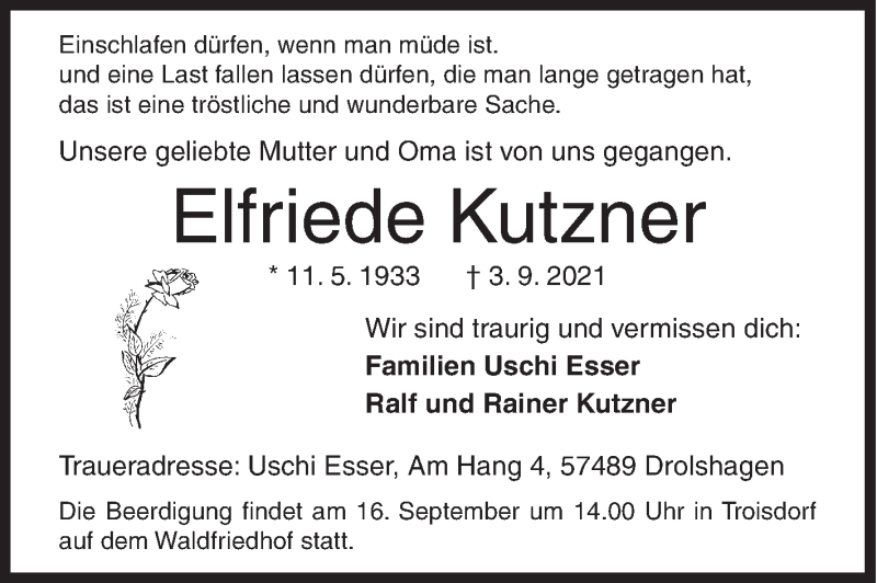 Hier finden Sie alle Traueranzeigen aus der Zeitung, die bisher für Elfriede Kutzner erschienen sind. Weitere Traueranzeigen, die in der Zeitung erscheinen, werden hier ebenfalls aufgelistet