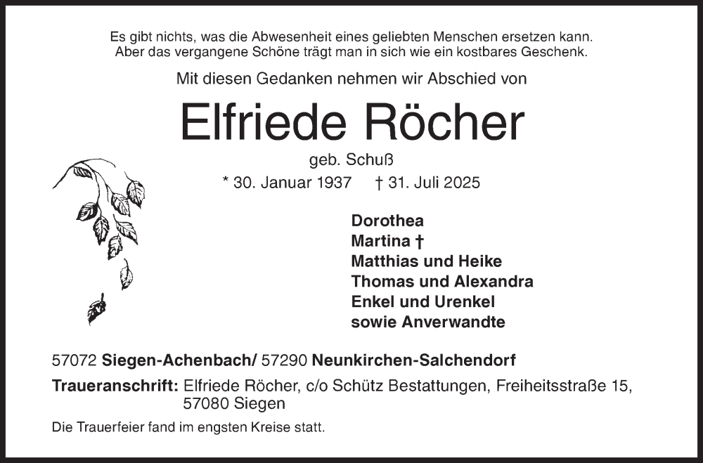 Hier finden Sie alle Traueranzeigen aus der Zeitung, die bisher für Elfriede Röcher erschienen sind. Weitere Traueranzeigen, die in der Zeitung erscheinen, werden hier ebenfalls aufgelistet