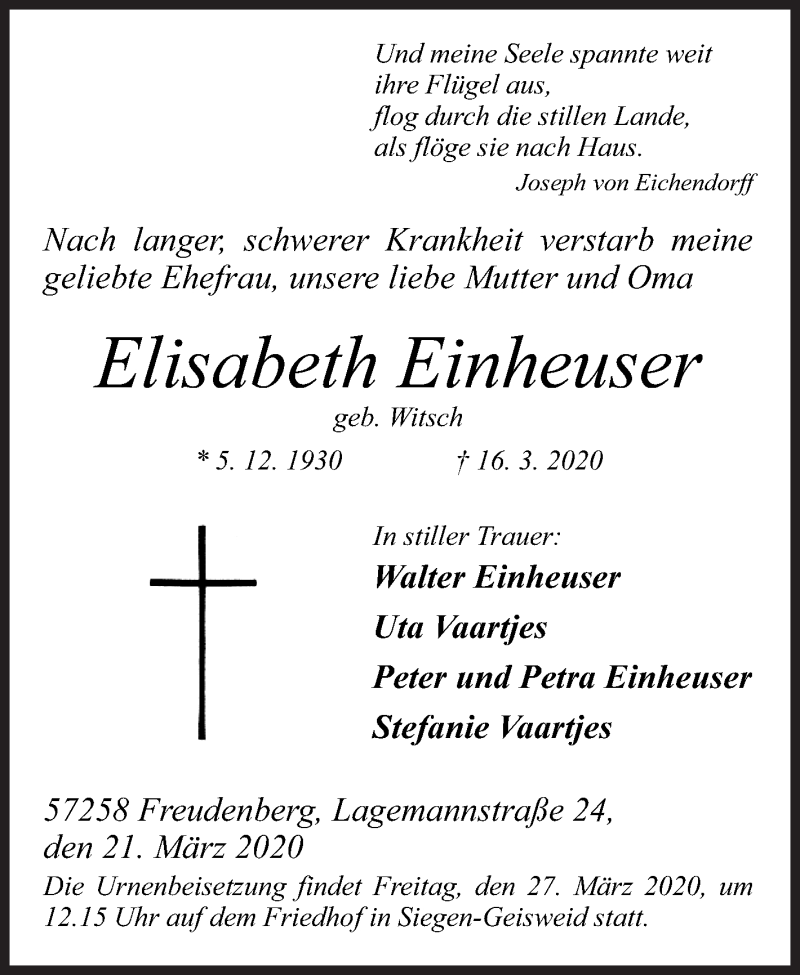 Hier finden Sie alle Traueranzeigen aus der Zeitung, die bisher für Elisabeth Einheuser erschienen sind. Weitere Traueranzeigen, die in der Zeitung erscheinen, werden hier ebenfalls aufgelistet