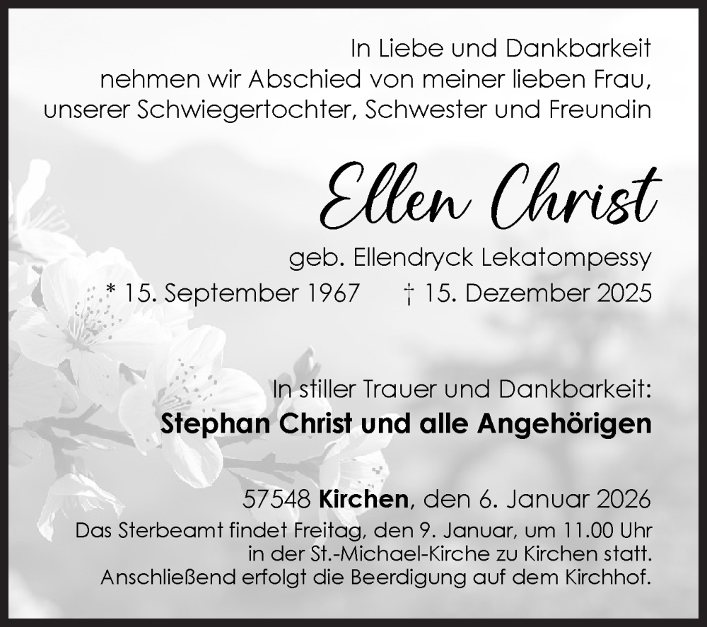 Hier finden Sie alle Traueranzeigen aus der Zeitung, die bisher für Ellen Christ erschienen sind. Weitere Traueranzeigen, die in der Zeitung erscheinen, werden hier ebenfalls aufgelistet