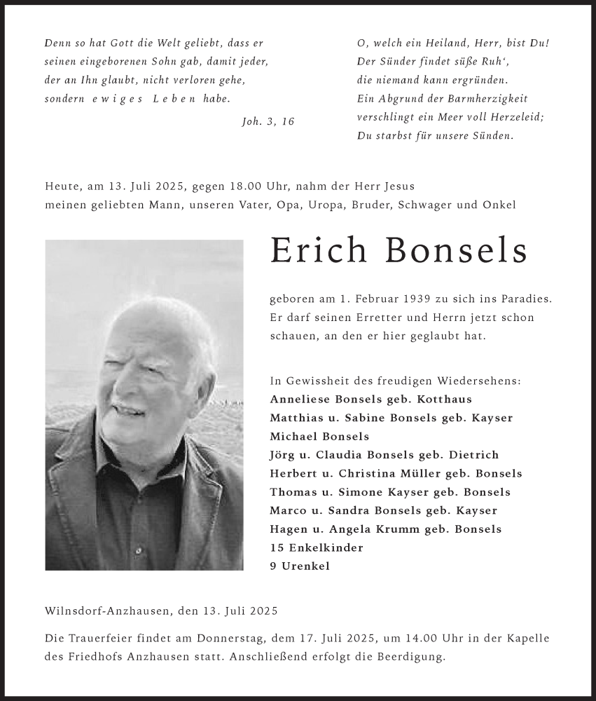 Hier finden Sie alle Traueranzeigen aus der Zeitung, die bisher für Erich Bonsels erschienen sind. Weitere Traueranzeigen, die in der Zeitung erscheinen, werden hier ebenfalls aufgelistet