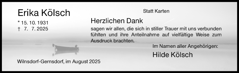 Hier finden Sie alle Traueranzeigen aus der Zeitung, die bisher für Erika Kölsch erschienen sind. Weitere Traueranzeigen, die in der Zeitung erscheinen, werden hier ebenfalls aufgelistet